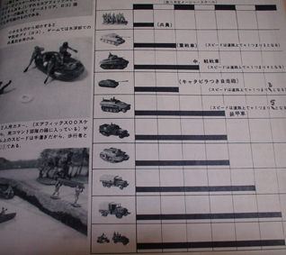 | 全長50cmを5cmごとに区切ったスケールを作り、移動と射撃に使う。 戦車は重・中・自走砲の3種類に分けられる。重戦車と自走砲はスピード2、中戦車は3。重戦車なら一回にスケールで2進めるというわけだ。 射撃は、a.対兵員、b.対装甲車&軟陣地、c.対戦車&硬陣地の3種に分けられ、それぞれに対し射程距離が決められていて、届く場合は命中判定のサイをふる。 残念ながら連載は長続きしなかった。なかなかルールもまとまらなかったようで、戦場作りというかジオラマ作りの記事もだいぶ混じってました。 |
