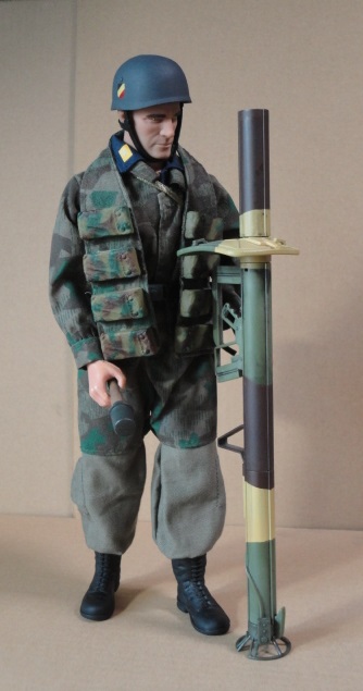 | 降下猟兵クルツ上等兵 降下猟兵(空挺隊)である。パンツァーシュレッケ装備…ただし帰ってから調べてみたら砲先端の照星と、防炎盾の手前にあるはずの照門がない。残念。首回りのベルトはKar98k用の弾薬ポーチ。他に手榴弾、スコップケース(スコップなし)、ガスマスクケース(中身は空)などいろいろ付いてる。 買わなかった他の兵士も同じようで、装備品がそろってるようでいまいち足りないんである。しかし本体はしっかりしていて使用感もなくきれい。ドイツ兵の箱つき完備品はだいたい5,000円以上が普通だから妥当なとこかな。10日ほど後に再来したが、全部売り切れていた。 それにしても子供の頃(小学生)はGIジョーでずいぶん乱暴に遊んだが、今のフィギュアは完全に観賞用。子供のおもちゃではない。精巧なできに感心するが、とにかくやわ。今回の撮影でもポージングしてる最中にKar98kのベルト通しが折れる、ガスマスクケースのベルトがはがれる。ヘルメットのベルトがヘルメットから取れるとトラブル続発。疲れた。そういや子供の頃持ってたバズーカは、ばねで砲弾が飛ぶようになってたっけ。 |
