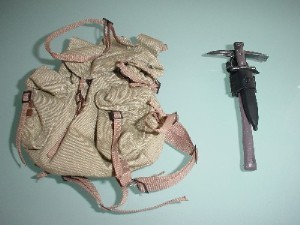 | US.1st Inf Div 荻窪の中古おもちゃ屋で購入。メーカー、商品名共不明。箱なし、中古品2500円。軍曹である、M-1トンプソン持ってる。ショルダーバッグしてるしサンダース軍曹というよりは、映画「プライベートライアン」のトム・ハンクス風。だがまぁ、よし、きれいだし。コルトガバメント、ガバメント用マガジンポーチ、ファーストエイドポーチ、水筒、銃剣も付いてる。腕の師団マークは伝統ある第1歩兵師団である。 2011年6月購入 |