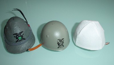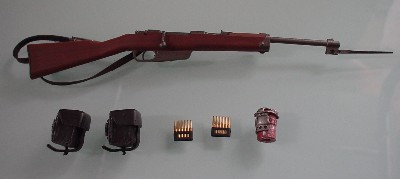 | (左)帽子とヘルメット3種。ヘルメットはちょっときつくて無理すると壊れそう。 (右)カルカノM1891カービン銃、弾奏ケースと弾。手榴弾・ブレダモデル35 通称“レッドデビル” 銃剣は折りたためるがとてもやわな感じで、子供のおもちゃには無理。 |