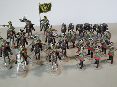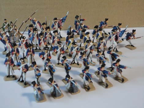 | (アメリカ軍歩兵)青・赤・白の制服なのでナポレオンのフランス兵と似てないかと思ったが、帽子が違うだけで雰囲気がかなり変わるものだ。敵役のイギリス軍は騎兵しか発売されていないのが残念。箱絵の塗装解説では襟や袖は黄色になっていたが、軍服の本や映画「パトリオット」を見ても赤いので赤にしておいた。 (イギリス軍軽騎兵)できはよく塗装もしやすい。あとはイギリス軍歩兵の発売を待つのみ。 |