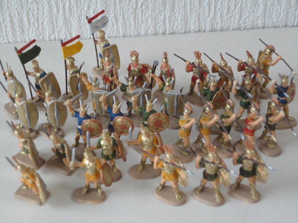 | どちらも子供のころ購入で素材の劣化が激しいのでやめようかと思ったが、塗装してみたら思いのほか楽しかった。 大事に保管していたはずだが紛失パーツが結構あった。ブリトン軍には騎馬戦車がもう一台あったがなくなっていた。 |