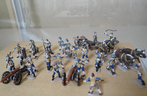 | 30年戦争(1618〜1648) Thirty years war ヨーロッパの多数の国と地域を巻き込み文字通り30年間に渡って続いた戦争。日本人には馴染み薄いが、この戦いでスウェーデン軍のグスタフ・アドルフが歩兵・騎兵・砲兵を統合した戦術の基礎を確立したといわれていおり、戦争の世界史の中では重要な戦争といえる。まだ銃が重く長かったので支えを使用しているところがユニーク。フィギュアとしては敵対する二つの歩兵のポーズがほとんど共通なこと、この時期に特徴的なパイクマン(長槍隊)の数が少ないことが残念。それに対し皇帝軍の砲兵は、ポーズの種類が非常に多い。 |