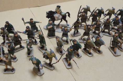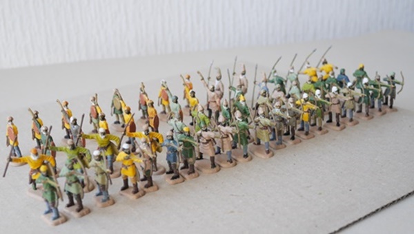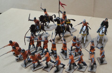 | Airfixのセットものでお城のプラモと一緒である。イングランド兵は騎馬兵がいるので総数が少ない。ジオラマならもう1セット必要だ。 服の色がわからないので映画「ブレイブハート」を参考にオレンジ色にしてみた。自分では気に入ってる。 |