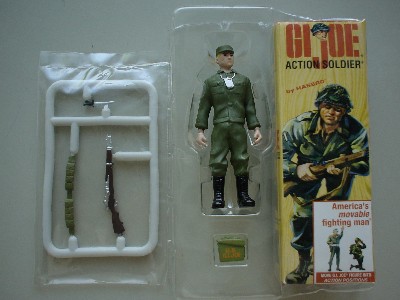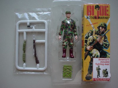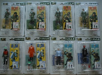 | G.I.JOE 40周年記念 1/35ミニチュア G.I.Joe's G.I.Joe のタイトルでタカラから発売された。 全8種。(うち一つはシークレットアイテム扱い) 箱絵は4種でARMY、MARINE、AIR、NAVY となっているが、MARINE(海兵隊)は迷彩服だがパラシュート兵である。可動部分はない。付属品もチョコチョコっと付いて可愛いが、ほとんどは付け替えて遊んだりはできない。 |