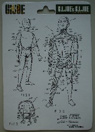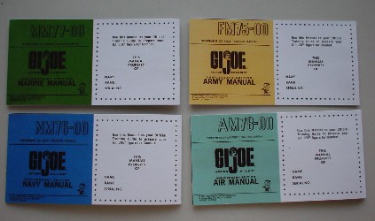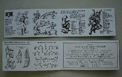 (上)台紙の絵図はすべて同じ。 中世の人体解剖図みたいで不気味。 (右上)一つずつに付属するマニュアル。 ARMY、MARINE、AIR、NAVY の4種の表紙。 (右下)マニュアルの中。基本的な遊び方、 ポーズの取り方や付属パーツのほか、 発売当時のセットの内容についての説明。 |