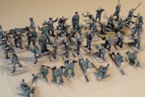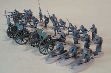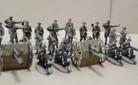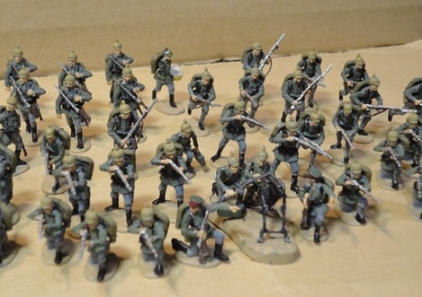 | ドイツ兵は塗装で最後まで悩んだ。サイトで博物館の展示品の写真をやっと見つけた。実際の色とは少し違うかもしれないが、WW1らしいふんいきを出したかった。<Airfix>のはヘルメットは浅めで布カバー&トンガリ付の初期の装備。<Ceasar Minitures>の方はヘルメットも深めでトンガリも消え、ボディーアーマーやガスマスク装備、手榴弾を大量に装備した兵士など、塹壕戦たけなわの後期装備である。このメーカーは初めて買ったが正解だった。 *一旦写真を掲載したが、やはり調べてみるともっとグリーン系だったようなので、歩兵2セットとも上着のみ再塗装した。 | |