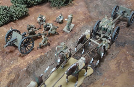 | <ZVEZDA>は腕、背嚢などが別パーツで、他のフィギュアの倍くらい手間がかかるものの見栄えはいいが、やはり大きめ。Airfixと並べるのはきつい。ズボンは普通のグレー、上着はグリーンがかったものにしてみた。初期の装備。さらに<EMHAR>の砲兵セットを購入。軍服の色は少しグリーンがかったものにしてみたが、やはりこの方がいい感じ。でも上の二つ…塗り替えるのは面倒だな…。 | |