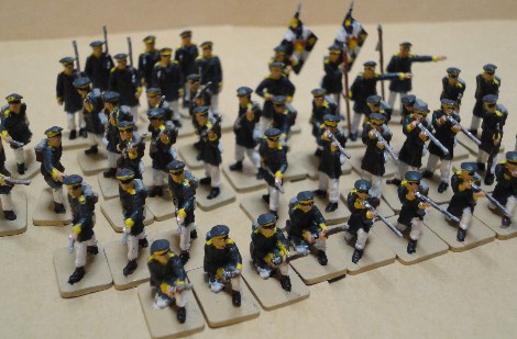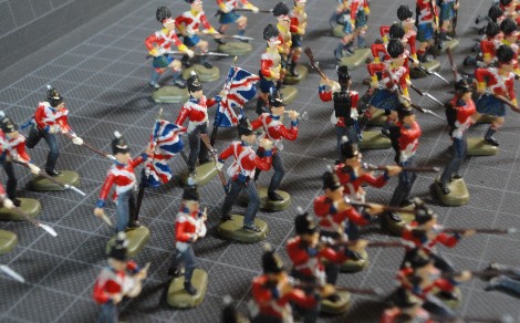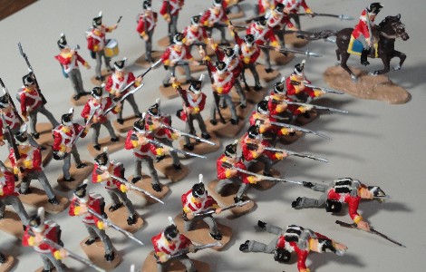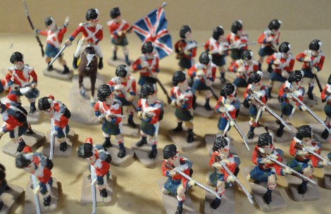 | イギリス軍歩兵 Waterloo British Infantry <Airfix> | イギリス軍歩兵とハイランド歩兵 British &Highland Infantry<Itareli> Itareliの兵隊はちょっとスマートすぎて可愛くない、特にイギリス兵が。このセットには伏せ撃ちするポーズがあるが、この時代はまだ先込め銃なので伏せ撃ちはしなかったはずだが。 |