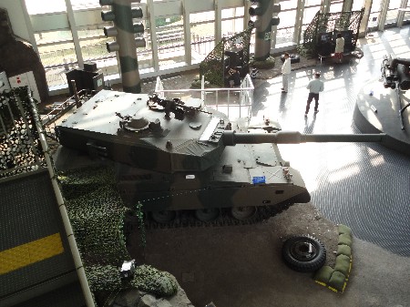 | 2階通路から見下ろした屋内展示場。ごらんの通り90式戦車とAH・1S攻撃ヘリが目玉商品。このほかガラス壁面の外にもずらりと車輌が並ぶ。 | |