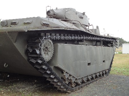 LVT(A)5装軌式水陸両用車 LVT(A)5 は太平洋戦争ものの映画でよく見るような気がするが、この75ミリ榴弾砲装備の型は戦後開発のものだという。 |