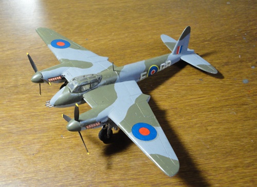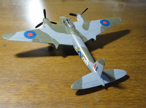 | モスキートMk4 (長谷川)古いキットであまりできはよくない。キャノピーなんか枠の部分もはっきりしないし、胴体との合い具合も悪い。それを修正する技術もないし。あまり気にせず完成させる。でもこの迷彩の二色のセンスがドイツやアメリカにはありえない…そこが英軍の魅力でもある。 |