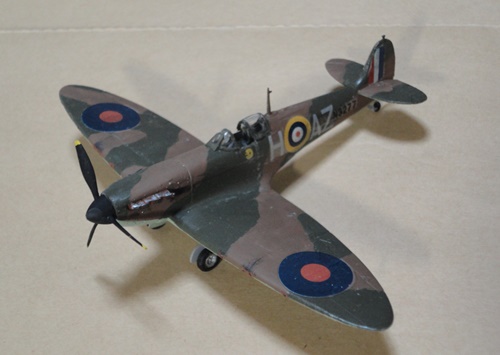 | スピットファイアMk1a (Af) スピットはレベルのを作ったことがある。特に好きな機体じゃないけど、これは飛行場ジオラマセット(トラック×2、整備クルーのフィギュアセット)が割引きされてたので購入。パイロットが乗り込むジオラマを予定しているので、キャノピーをカッターで切り、開いた状態に。 |