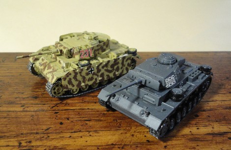 V号突撃砲(左)は40年以上前に50円で買ったミドリ(緑商会)の“セメダイン不要、フリクションで動く”おもちゃプラモ。パンサー(右)エアフィックス最初期のモデルだ。 |