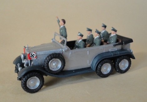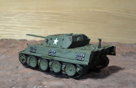 TV「コンバット!」の常連やられメカ、ドイツ軍ハーフトラックを作ってみた。元のキットはハセガワの1/72M4A1ハーフトラック(迫撃砲搭載)。オープントップをプラ版でふさいで、回転銃座を自作。これはやわらかいプラ版を円錐形にして何枚も張り合わせた苦心作。あとは前部のウィンチのついた大型バンパーを撤去してローラーバンパーを自作。ボディサイド後部に雑のうラック。機銃と機銃手、運転手は他のキットから流用。塗装はモノクロTV映像のイメージ重視でライトグレーにしてみた。 |