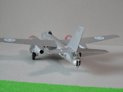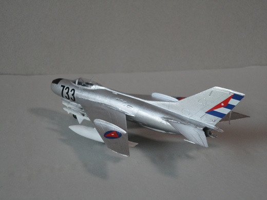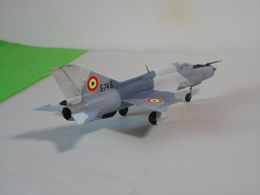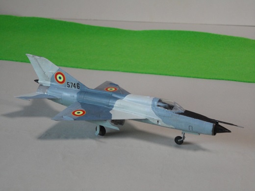 | Mig-21(ランサーC) もひとつミニジェットシリーズ このシリーズは全面シルバー塗装が多いのがつまらない。そこでいろいろ探したらルーマニア空軍で2000年以降も使ってるってのを見つけた。もちろんそのままではなく、電子機器など改修して“ランサーA〜C”という名称だそうだ。塗装も3色迷彩で、グリーン系とライトブルー系があってライトブルーの方が精悍でなかなかいかす。機体は手をつけず塗装だけ真似てみた。デカールはフランス軍(赤白青)の白い部分を黄色に塗って代用。機種にも4桁の数字を入れいたいのだが、小さい数字がなくて省略。(2014/10) |