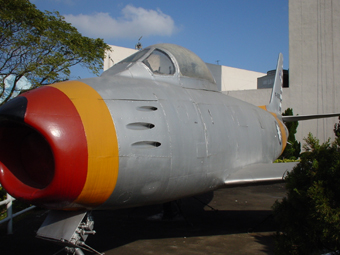 | F-86F セイバー せっかくの正面位置だが、植木がじゃましていい写真が撮れない。 | |