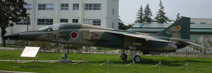 | F-1 支援戦闘機 ’06年3月退役だそうだ。練習機T−2を改修しただけ、ということで操縦席の後ろが(複座だった名残で)意味なく膨らんでいる。 |
