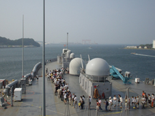 ←さらに30分歩いて側舷。 さらに15分、やっと乗船。→ 今年最高の暑さと報道された日に、炎天下2時間15分も並んで乗った船は、機関砲(一門)がなかったら軍艦かどうか区別つかんようなつまらん船だった。 去年も一昨年もブルーリッジだったそうな。2000年と2001年は空母キティホークだったそうな。 |