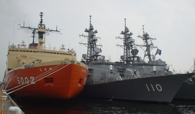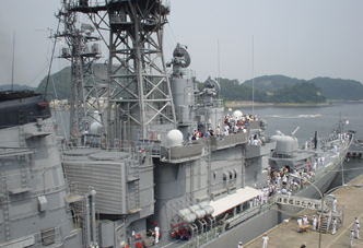 | 左から:しらせ(砕氷船)、たかなみ(護衛艦)、ありあけ(護衛艦)、米海軍J.S.マッケイン(イージス駆逐艦)と並ぶ〜順路に従って乗船見学できる。 | 護衛艦はたかぜ これは見学だけでなく(事前の申し込みで)体験航海。 |