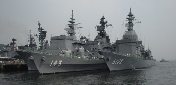 右から あすか(試験艦) しらね(護衛艦) うらが(掃海母艦) その奥は はたかぜ(護衛艦) |