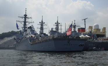 | 支援艦(YF2147)で港内を回る。 (左)米海軍J.S.マッケイン (右)見学用以外にもあちこちに停泊中の艦艇を見ることができて楽しい。 | |